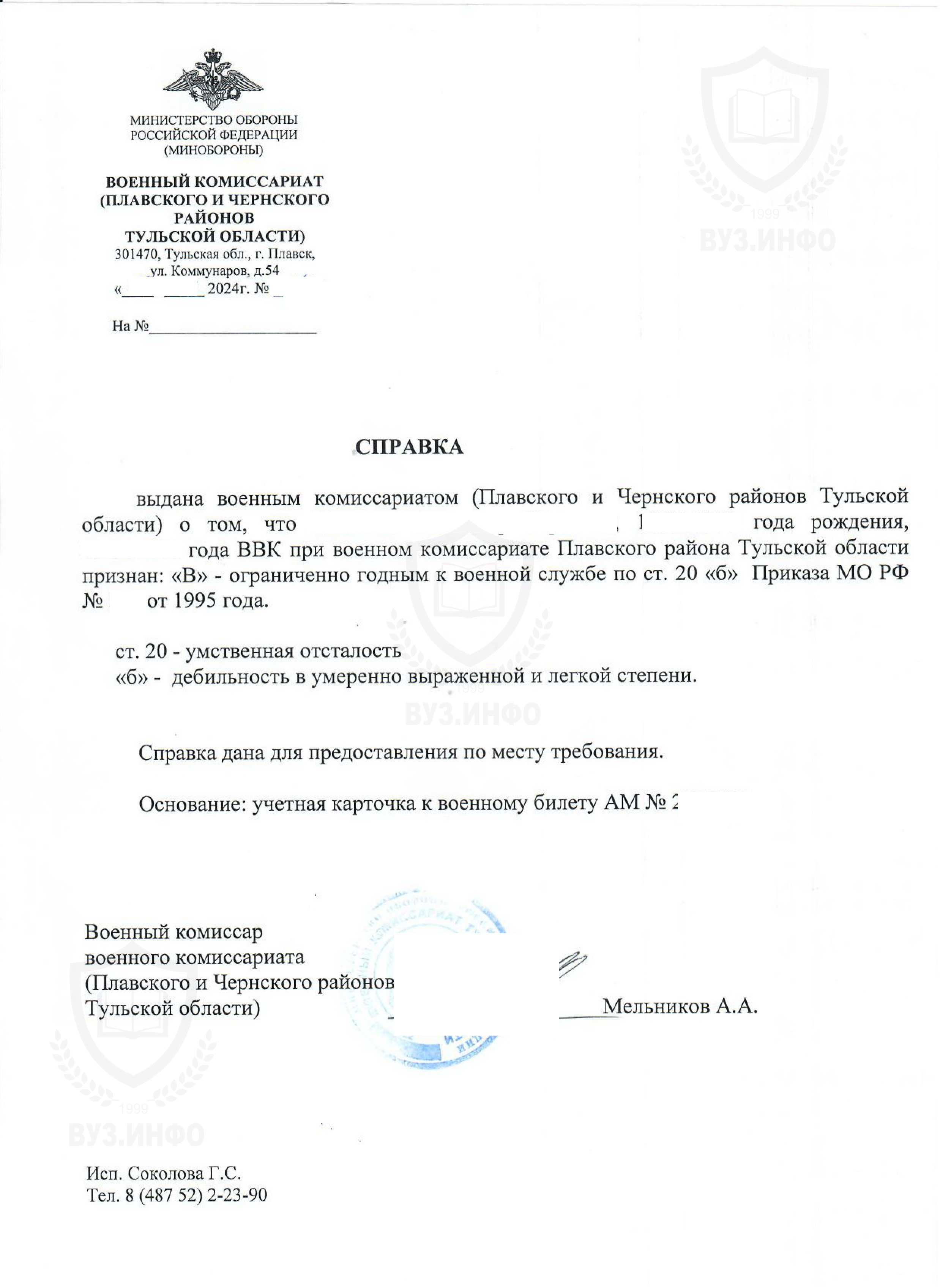 - Печать (штамп) военкомата.